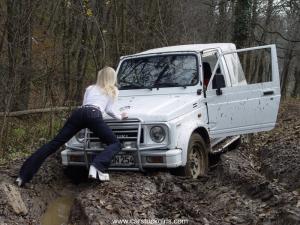Now the jeep probably reached its limits. Michelle gets the jeep stuck in a deep mud hole. It moves only some meters forwards and backwards, but seems to be unable to get out there anymore! Michelle tries to help the jeep a little bit. But this is not what she thought of offroad-adventures. So what for has she got a jeep???? What do you think: Does she get her jeep out there anymore?